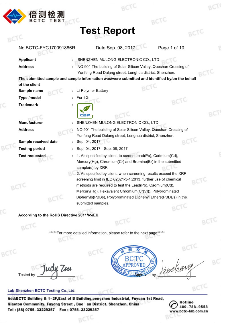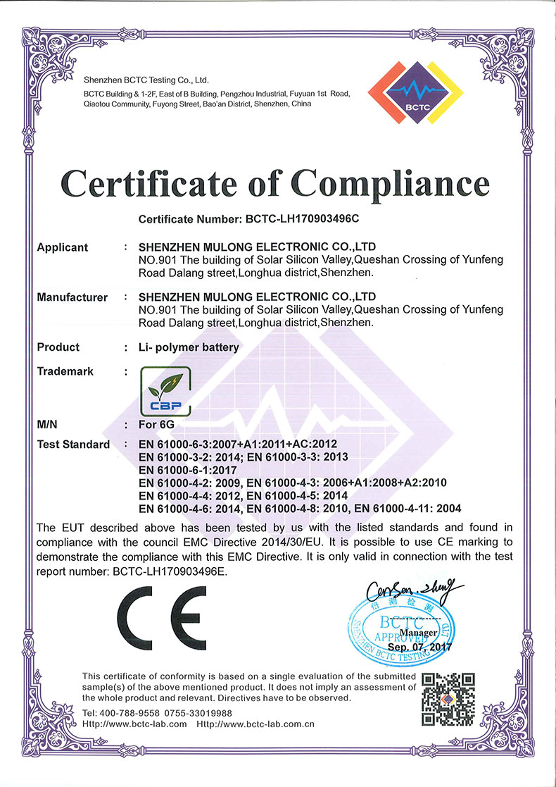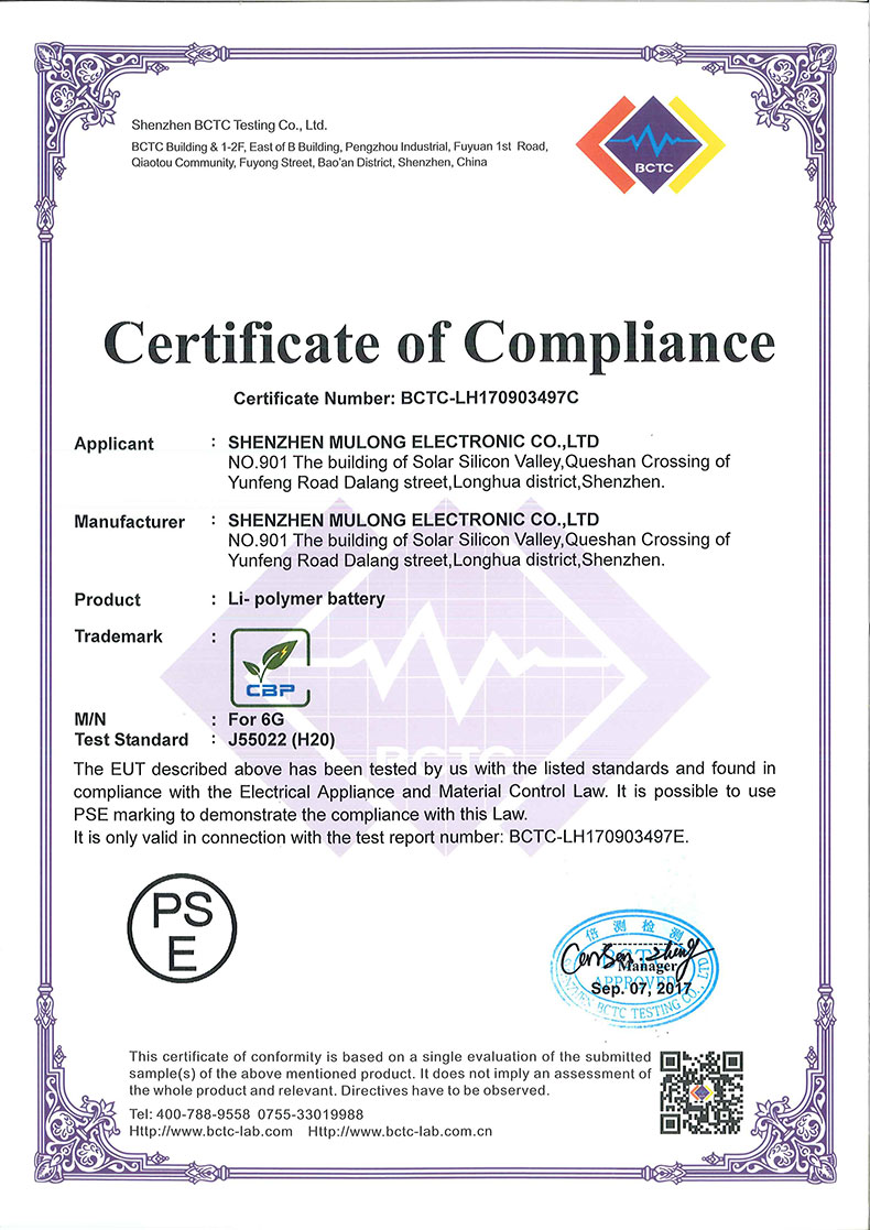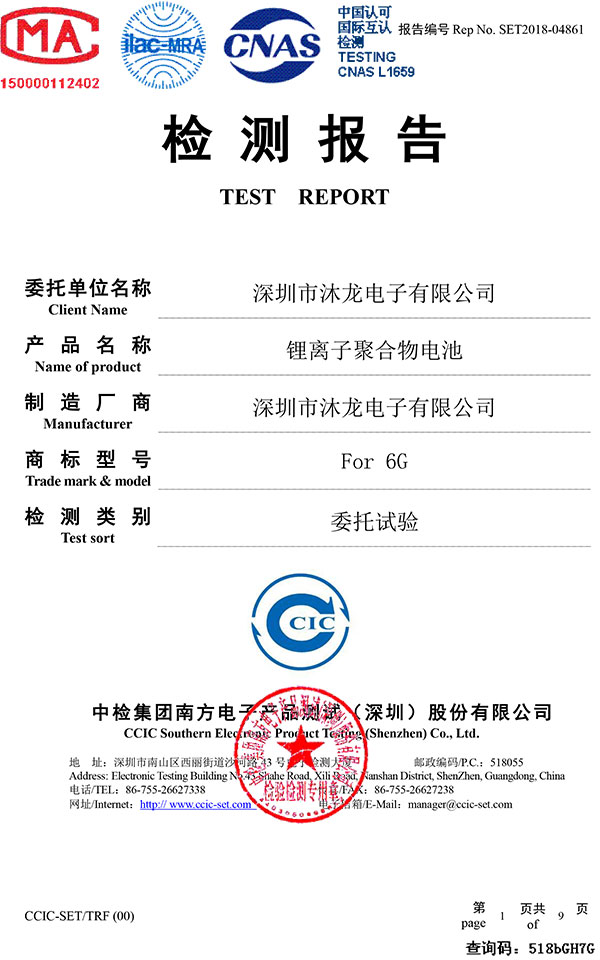 惠州市沐龍電子科技有限公司成立于2007年,所生產(chǎn)iphone替代電池已經(jīng)獲得歐盟ROHS CE證書,日本強(qiáng)制性認(rèn)證PSE證書,符合國(guó)際航空UN38.3安全標(biāo)準(zhǔn), 上天貓質(zhì)量檢測(cè)報(bào)告。