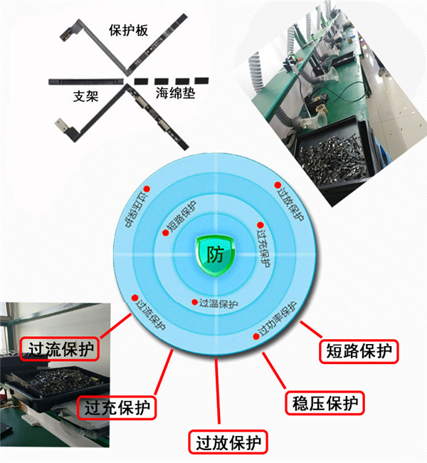 1:智能型內(nèi)置電池保護(hù)電路,具有防過充、過放、過流(短路)、過熱四重保護(hù)功能。